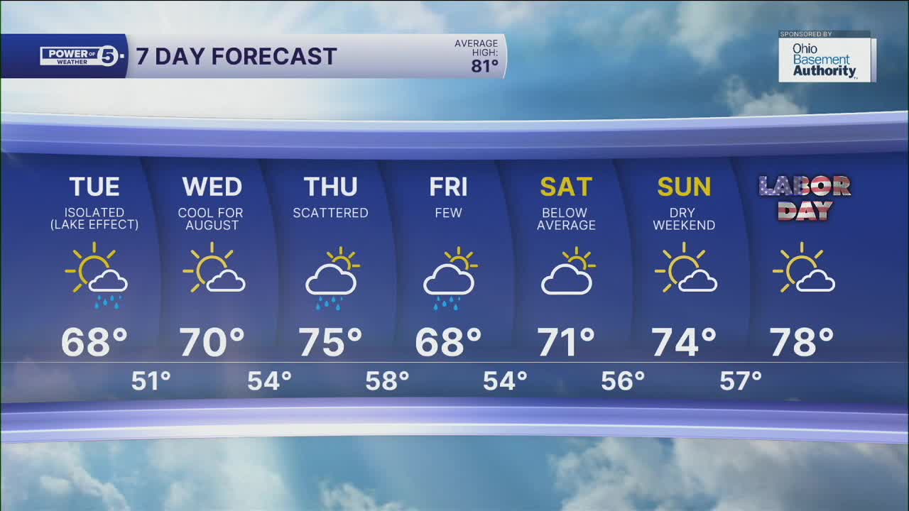 The coldest morning will be on Wednesday. Lows in Downtown Cleveland could be as chilly as 51 degrees. Some records will be tested on Tuesday night! Temperatures try to warm by mid-week, with highs in the mid-70s, but that is still below average for the end of August. Typically, afternoon temps are in the low 80s this time of year.