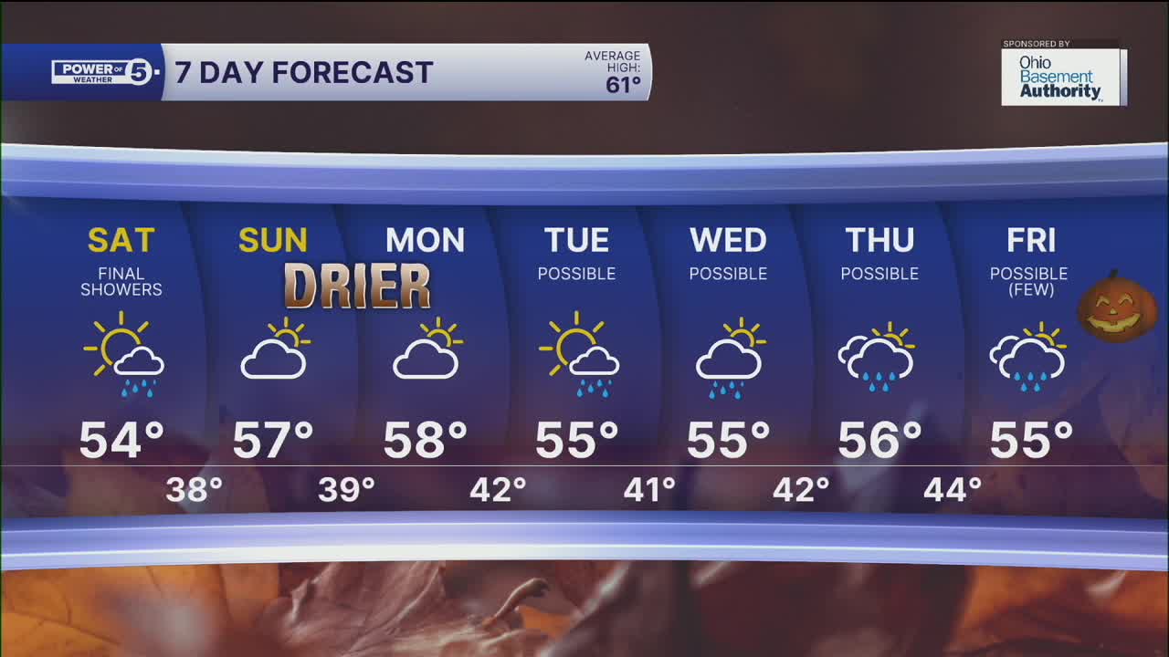 CLEVELAND — The lake effect rain machine is finally being switched off! Plan for a few showers in our NE communities overnight and into early Saturday, along with thicker clouds. Those clouds will prevent temperatures from cooling too much. Closer to the lake, plan for temperatures in the mid-30s to low 40s by early Saturday morning.