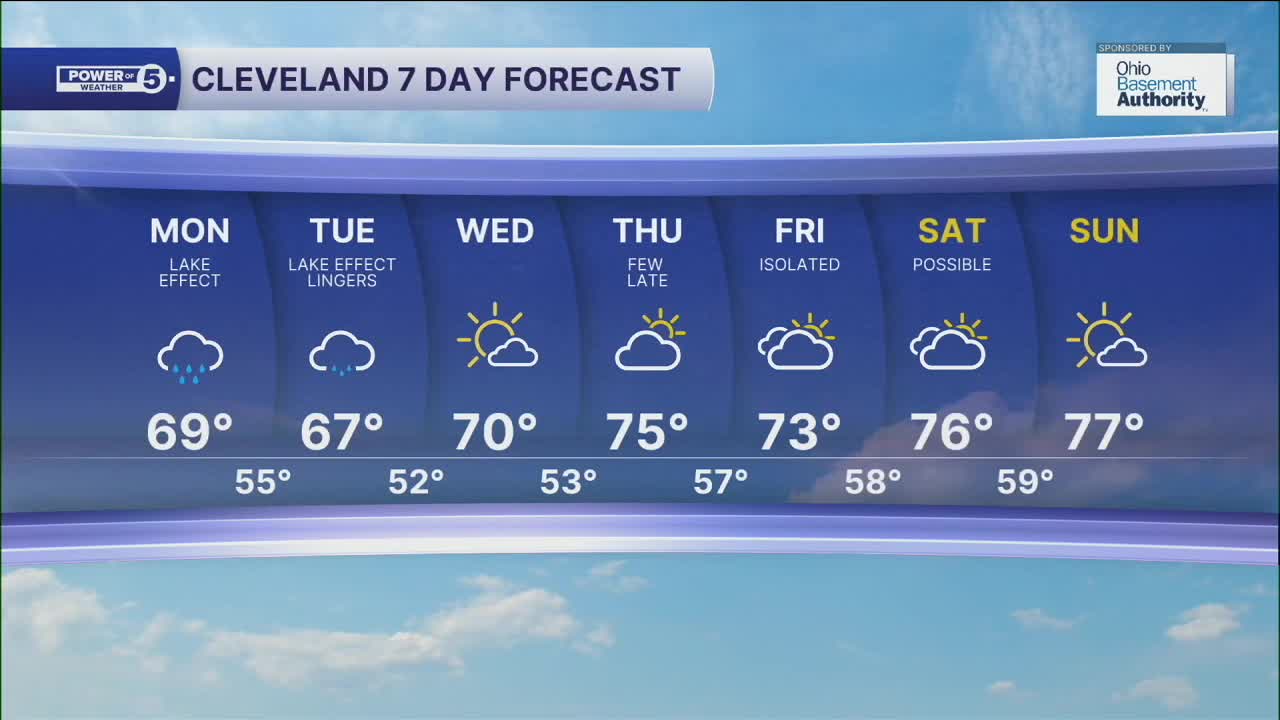 CLEVELAND — Highs may not break 70° in many areas on Monday and Tuesday. This much cooler air (60s) moving over a "warm" Lake Erie will bring the threat of lake-effect rain to some on Monday, especially Monday night, and possibly lingering into Tuesday. Thunder will be possible, along with Waterspouts, so you will want to remain on shore in the coming days.