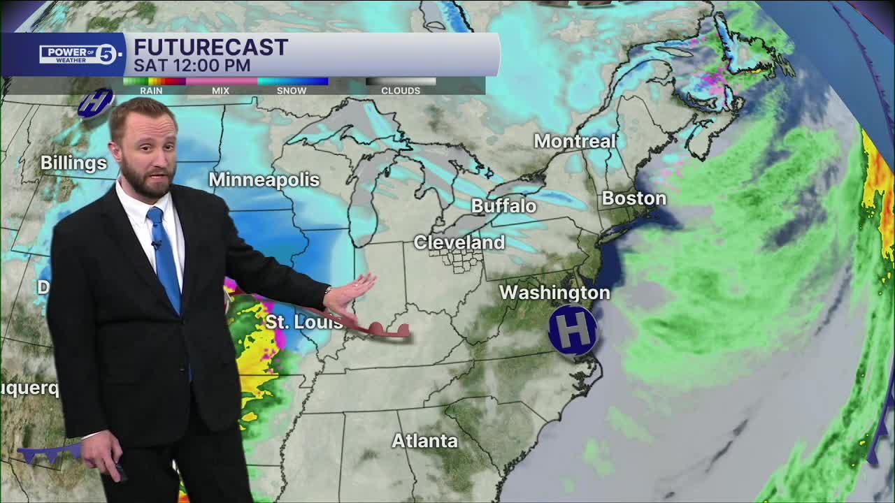 CLEVELAND — Lake effect snow will gradually taper off Friday night, but snow returns Saturday afternoon west and evening east. A storm from the west will produce over a foot of snow across parts of the Midwest, but our area will be on the warm side of the storm. Initially, Saturday night, Northeast Ohio will likely see one to three inches of snow, before changing to a mix then rain Sunday morning.