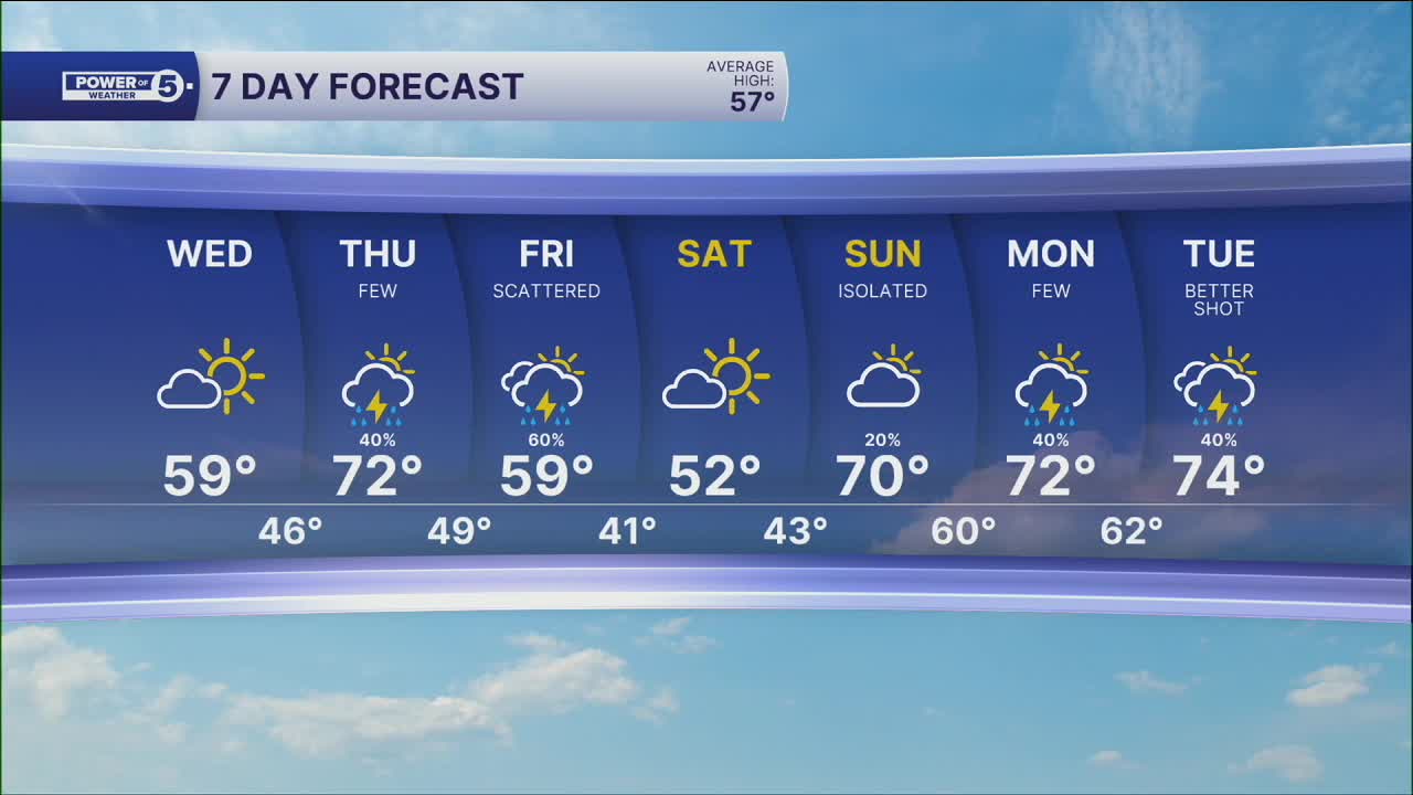 Wednesday: Mostly sunny and seasonable.| High: 59°