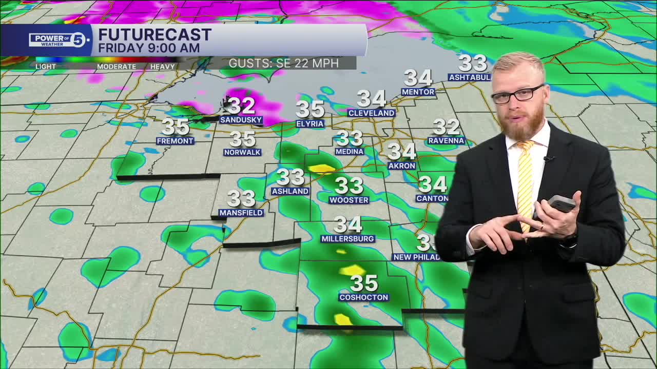 The ice will change to rain for everyone by midday, quickly ending the ice threat and improving road conditions. Still wet and slick, but at least not icy for the second half. This storm is essentially one large warm front for Northeast Ohio, meaning temperatures will warm through the weekend. Low to mid-40s on Saturday, mid-50s even on Sunday. That is when our next storm approaches, with the potential not only for rain but also for evening t-storms.