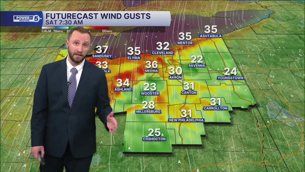 CLEVELAND — Winds will remain strong, with gusts of 30 to 40+ for most of the overnight. Temperatures will tumble, big time, down to below freezing by 6 a.m. as the morning commute commences. That rapid drop with high wind and lots of standing water will lead to a flash freeze across much of the area. So you will want to give yourself extra time to get anywhere Friday morning.