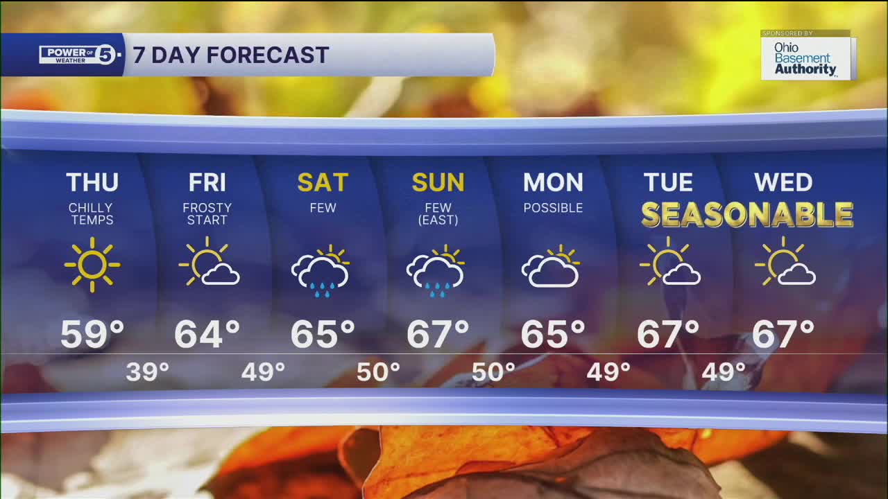 CLEVELAND — Dust off the heavier jackets and coats, we're staying BELOW average for the next few days. As high pressure builds into NEO following Tuesday's cold front, clear skies, calmer winds, and cooler temperatures could lead to frost development tonight and tomorrow night. A frost advisory has been issued for Ashtabula County tonight, but it looks even colder Thursday night/Friday morning.