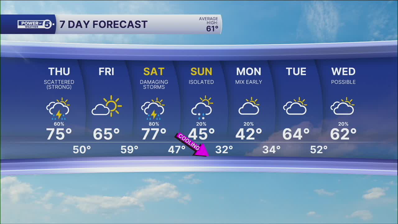 Those storms will be ahead of a cold front that will usher in much colder temperatures by Sunday. A stray flake could even be possible on Sunday and Monday!