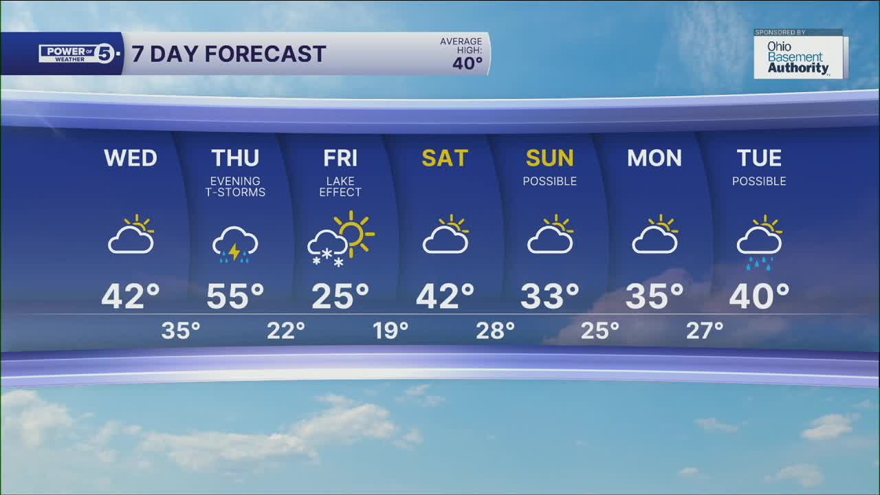 It will be even warmer on Thursday, but it will be hard to enjoy with the high wind and thunderstorms later into the evening. Highs are expected to reach the middle 50s, and even some south of Canton could reach 60 degrees. Showers are possible west of Cleveland through the afternoon, and a squall line of strong storms and 60 mph gusts is expected to cross the metro around 8 or 9 p.m. tomorrow. It will be like a springtime storm. The timing looks to be in our favor now, with the storm slowing down enough to spare the evening commute of the brunt of the storm.