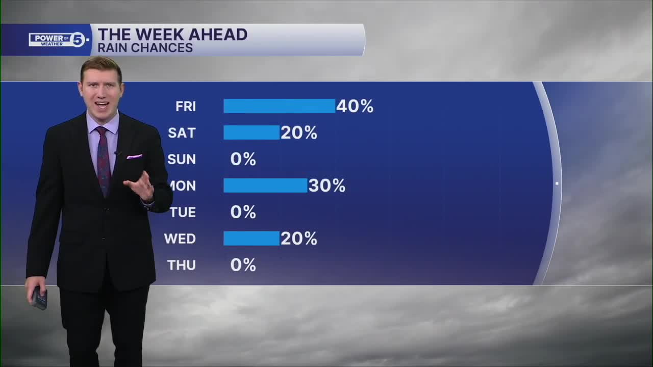 CLEVELAND — After one to two-plus inches of rain on Thursday, it has been a dry start to Friday. A few isolated lake-effect showers are possible later this evening for a few trick-or-treaters.