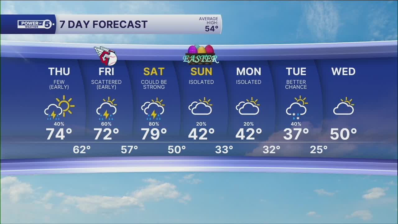 Friday will also be warm with above-average temperatures in the 70s, but the storm chance increases. It does not look like widespread storms, but during the afternoon, storms will start to bubble up. These will be hit-or-miss downpours...and that includes Progressive Field. While it will be mild, grab the poncho, just in case one of these pop-up storms develops over the Guardian's Home Opener.
