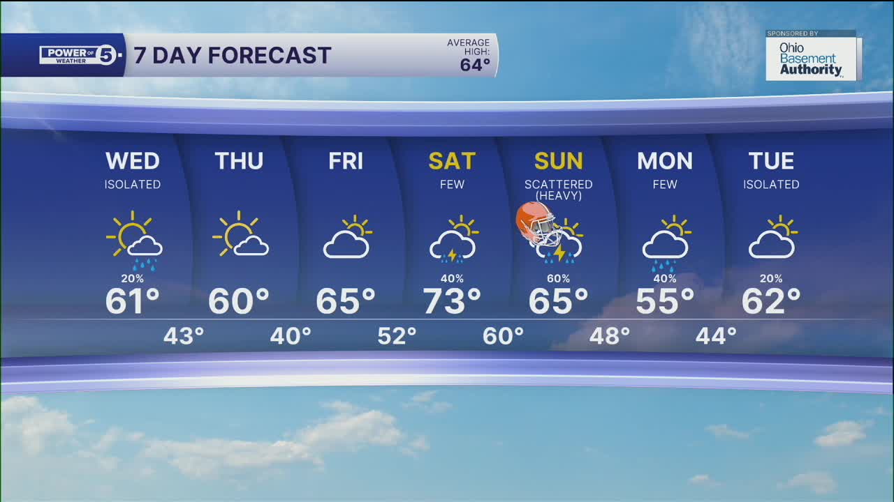 Temperatures will bump back up to round out the work week, as highs will top off in the mid to upper 60s on Friday, under partly sunny skies. Ahead of a cold front, temperatures will be even warmer to begin the weekend, with highs in the mid 70s on Saturday. The front will usher in better rain chances by late afternoon through Sunday, which could impact the Browns game on Sunday afternoon. Cooler air will filter in for the start of the new work week, as highs fall into the mid to upper 50s, along with a few lingering rain chances on Monday and Tuesday.