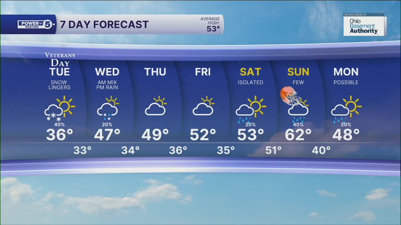 Veteran's Day: Lake Effect snow squalls (mainly east). | High: 36º (feels like teens)