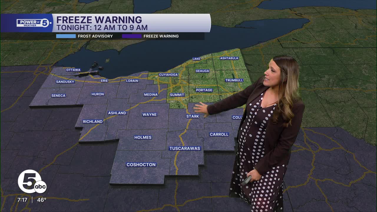 A freeze warning has been issued for several counties across NEO, south of Akron and west of Cleveland. This is where we are expecting clouds to clear the most, allowing temperatures to fall below freezing, and could be as cold as 28 or 29 degrees in a couple of spots.