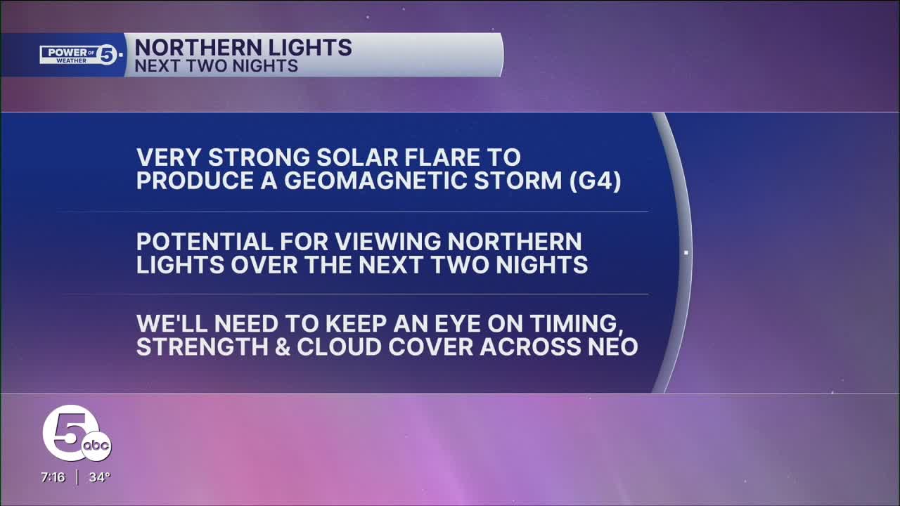 The strongest part of the storm/best chance to see the northern lights is expected tonight and Thursday. This watch was issued due to coronal mass ejections or CMEs that have erupted from the Sun over the past several days.