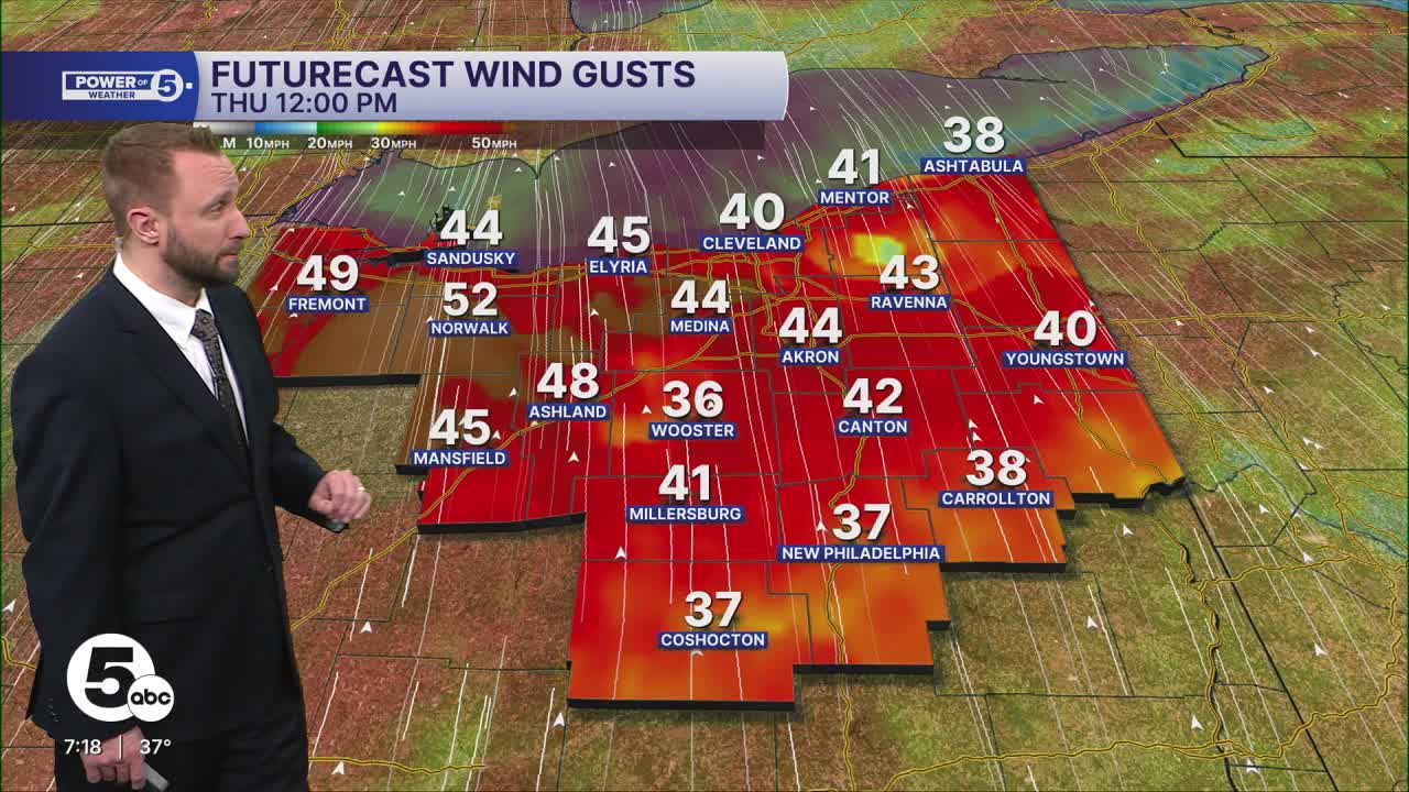 Winds out of the south and southwest will pump in more above-average warmth into Northeast Ohio during the day Thursday. High temperatures will be in the 50s, but unfortunately, the winds will not make for much enjoyment of the warmth.