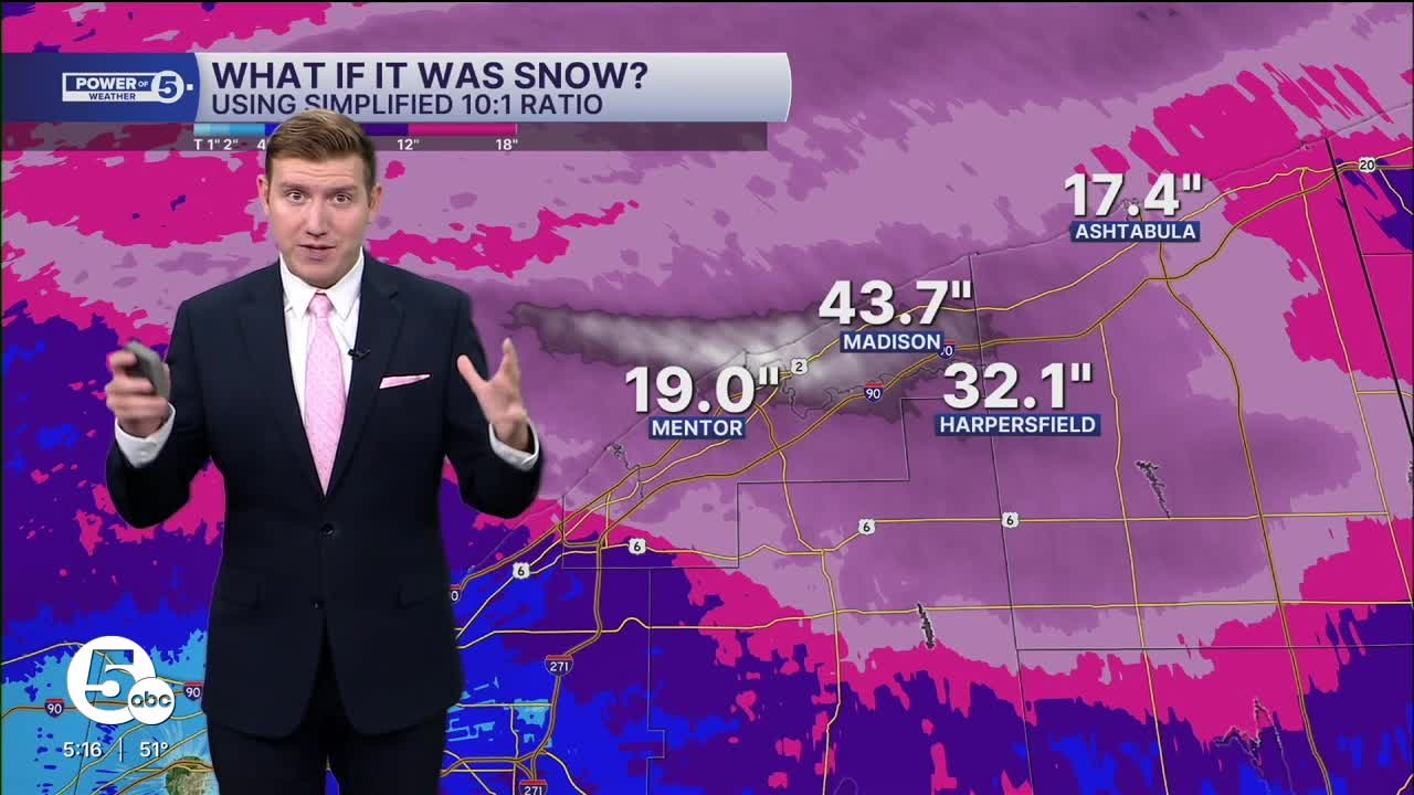 An intense band of lake-effect rain crashed onshore Wednesday night, dumping more than three inches of rain across parts of Lake, Geauga, and Ashtabula counties. These areas are synonymous with being in the "snow belt" when lake-effect falls in the form of blinding bursts of heavy snow. This time around, with temperatures in the 40s and low 50s, it was mostly rain (and some graupel!) instead of snow. How much snow could this amount of rainfall produce?