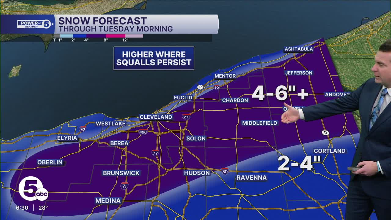 When all is set and done between Sunday's clipper and Monday's lake effect snow, 4 to 6 inches is likely in the purple-shaded area, from Eastern Lorain through to Ashtabula counties. Isolated 7 or 8-inch amounts are possible where squalls persist, most likely in Geauga County.