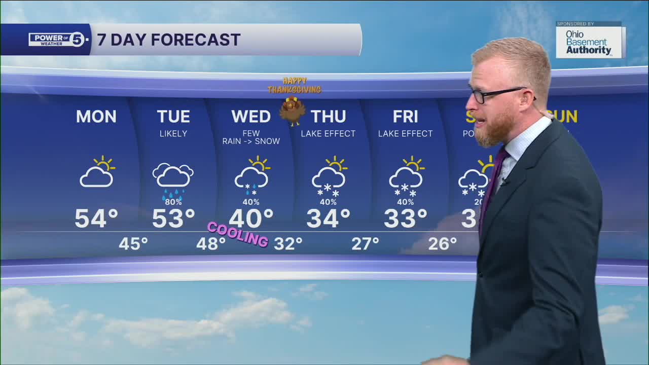 CLEVELAND — The work week will begin dry, but this will not last long, as Tuesday is expected to see potentially heavy rain. A large storm, spanning over a dozen states, will bring rain on Tuesday, with some lingering showers through Wednesday. The storm will then pull significantly colder air by Thanksgiving and Black Friday.