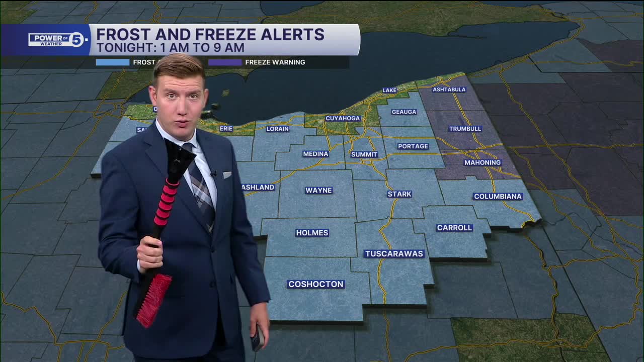 Another upgrade is for interior Ashtabula County, where a Freeze Warning has been issued for the same timeframe. Low temperatures south of I-90 may dip to the freezing mark, 32 degrees.
