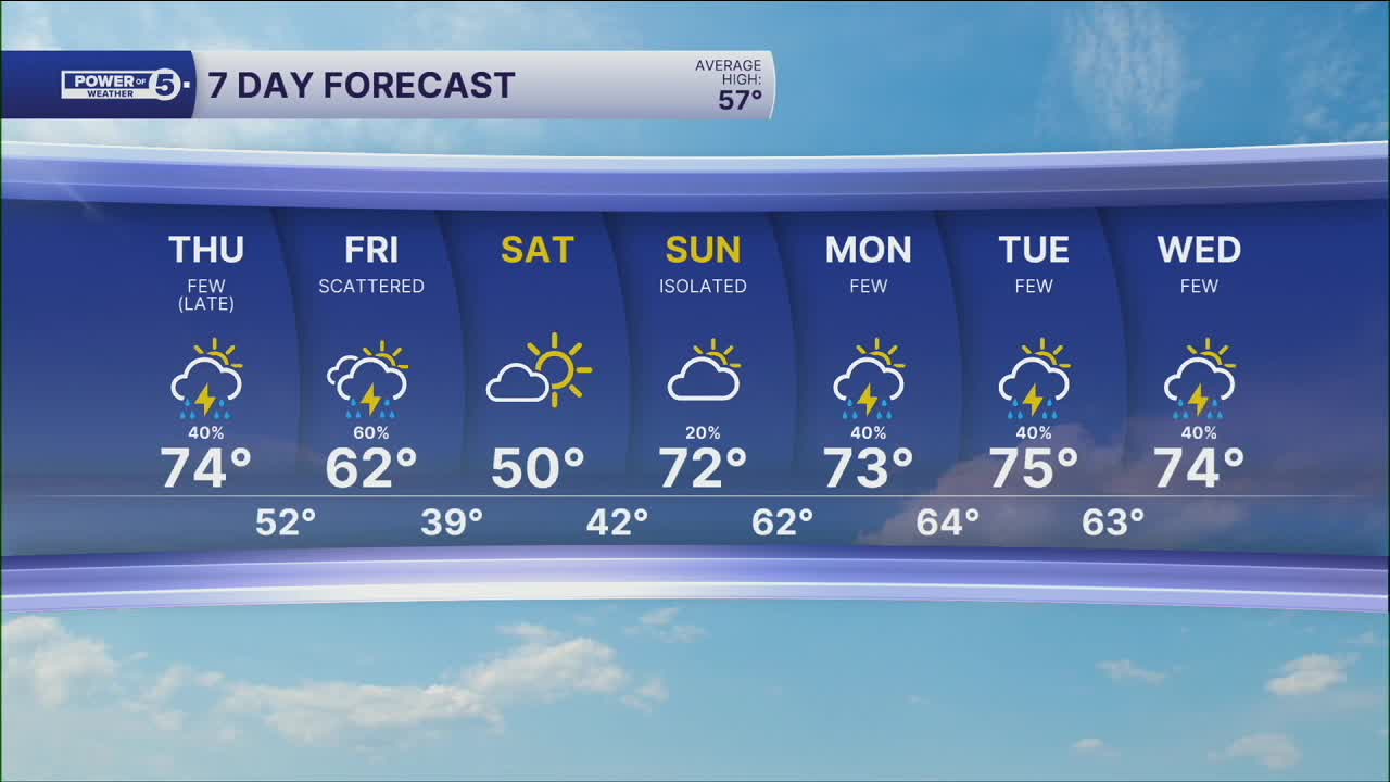 CLEVELAND — Temperatures will bump up even more on Thursday. That warmth comes with rain, though. A few t-showers roll in during the afternoon and continue into the evening. The best chance to see this rain is in the northern half of our viewing area.