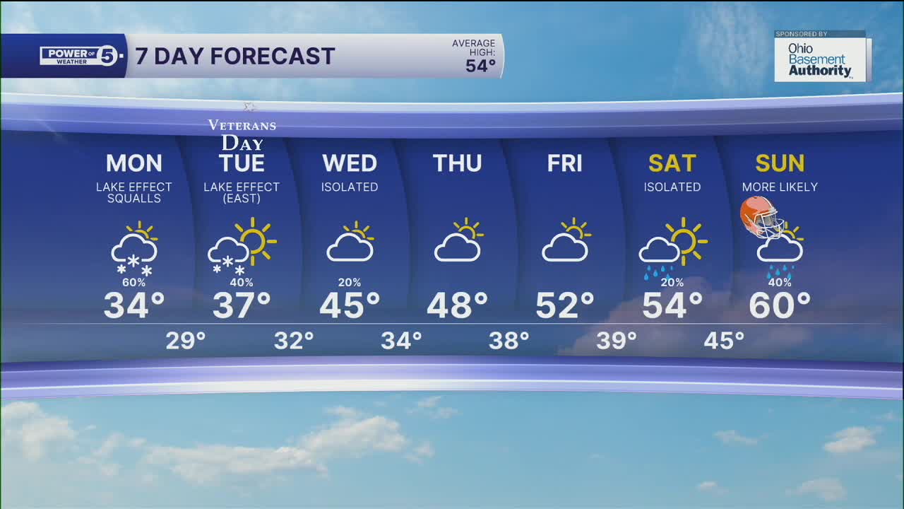 Monday: Lake effect snow squalls. Windy & cold. | High: 34º (feels like teens)